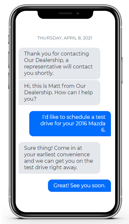 Schedule a Demo95% of text messages are opened and responded to within 3 minutes of being delivered. Generate more leads and appointments via website texting. Your customers are using one of the most responsive methods of communication possible to buy cars. Your Dealership Should Too!