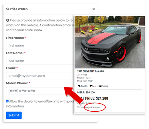 When customers research the inventory on your website, they can sign up for email/text alerts by clicking the “Price Watch” button located below the pricing of each vehicle on both the SRPs and VDPs – it’s that easy.
